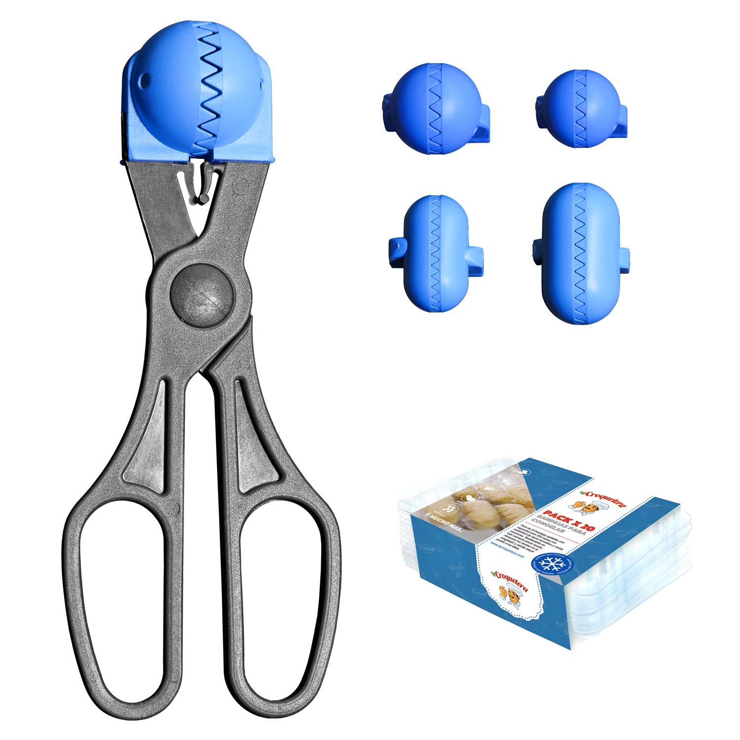 Pack utensilio multiusos con 4 moldes intercambiables color azul + 20 bandejas de conservación – La croquetera: patentado y fabricado en España – LC015