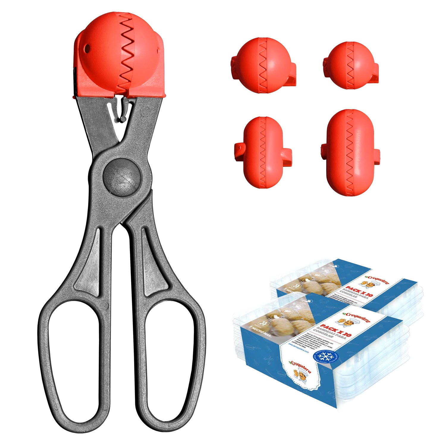 Pack utensilio multiusos con 4 moldes intercambiables color rojo + 40 bandejas de conservación – La croquetera: patentado y fabricado en España – LC025