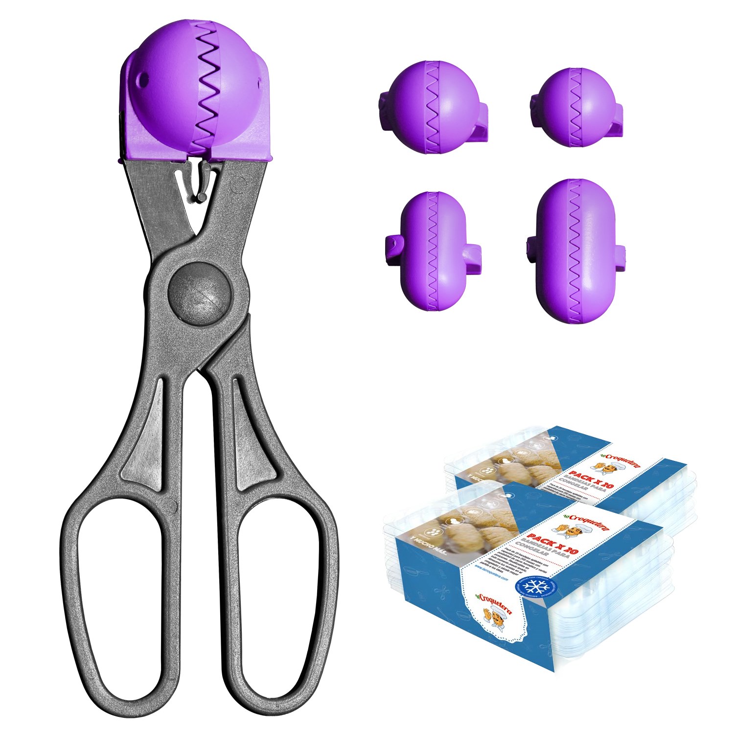 Pack utensilio multiusos con 4 moldes intercambiables color morado + 40 bandejas de conservación – La croquetera: patentado y fabricado en España – LC029