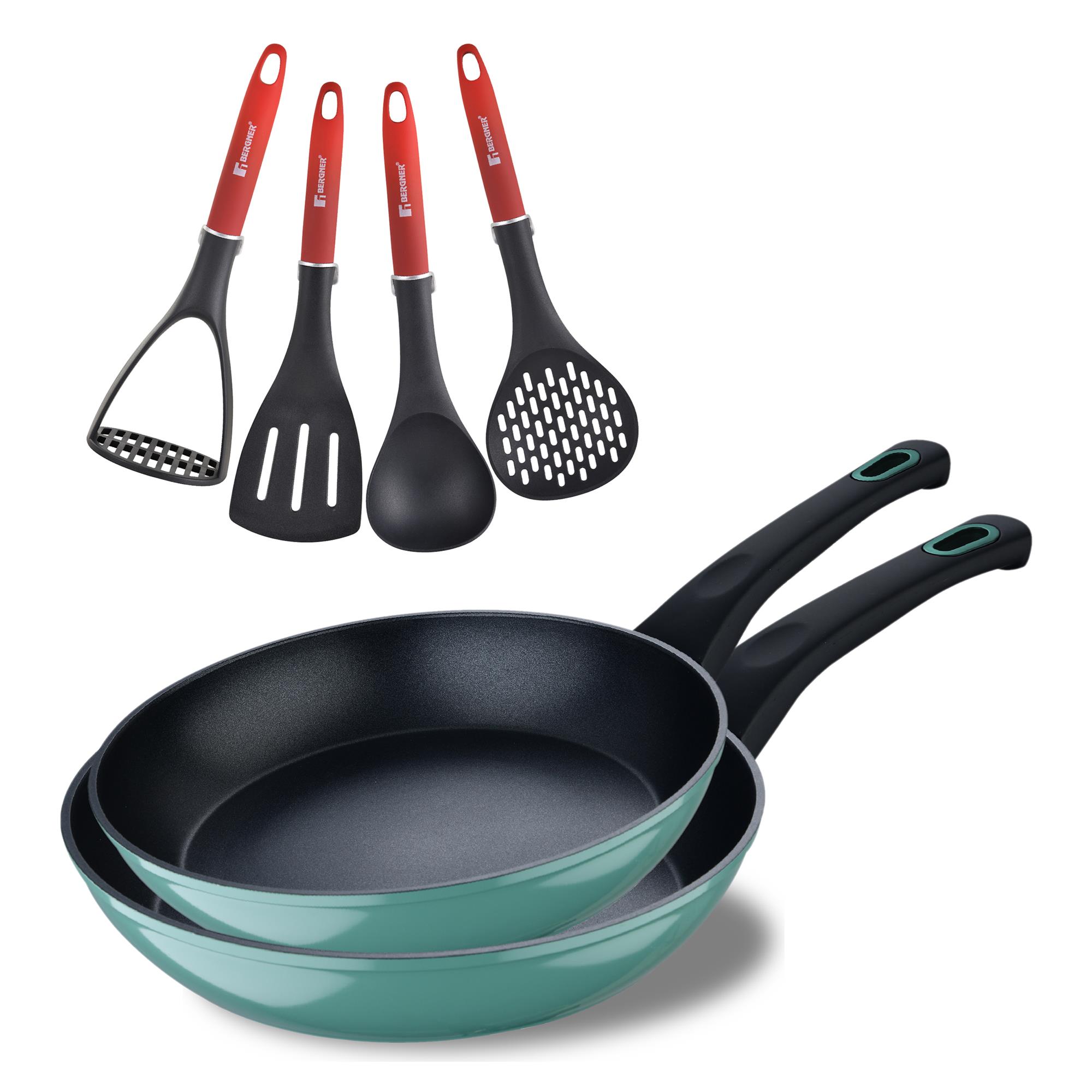 Juego de 2 Sartenes Ø20Ø26cm CLASSIQUE en aluminio forjado antiadherentes + Utensilios de cocina verdes Bergner – Q4710