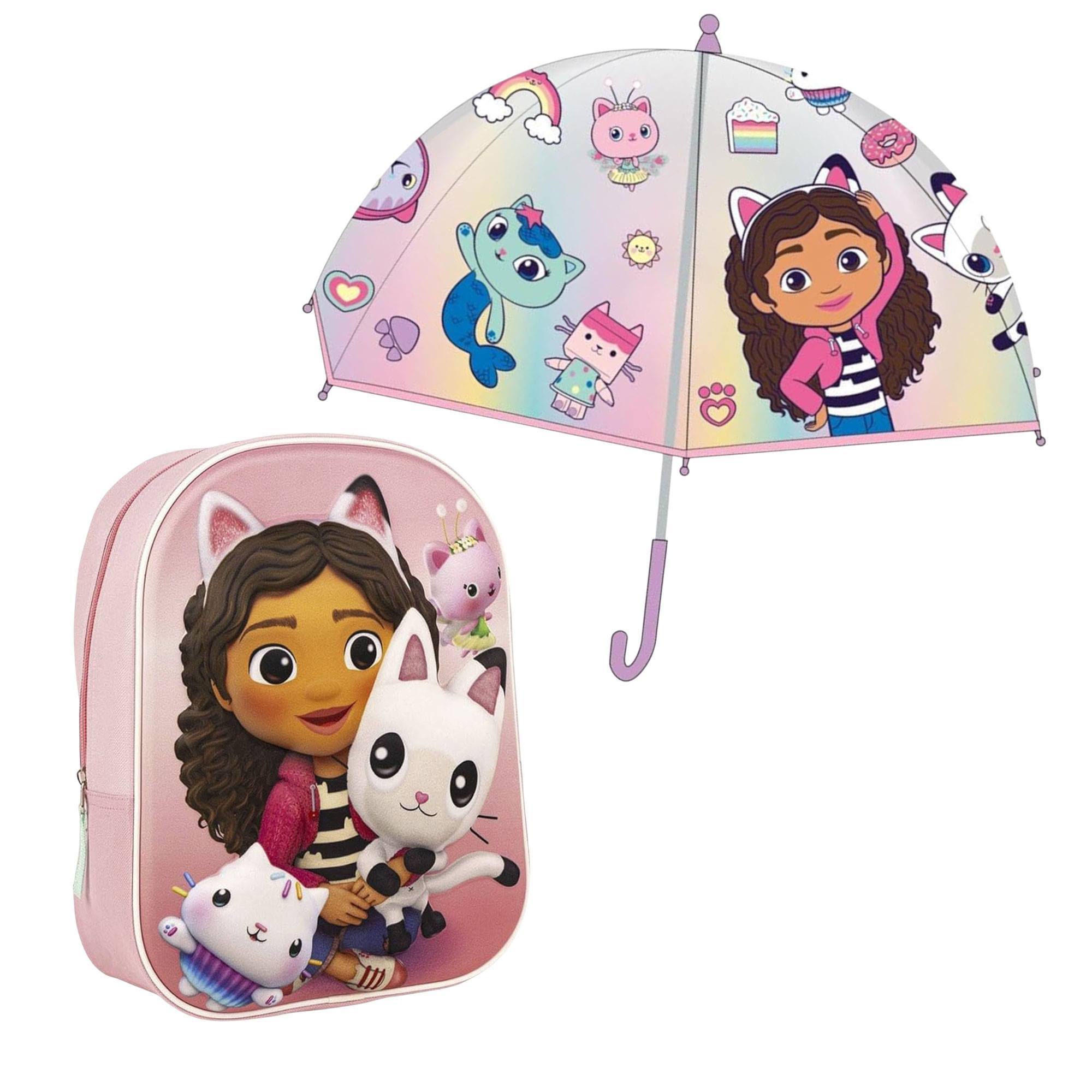 Set de Mochila 3D infantil de GABBY’S DOLLHOUSE + Paraguas de Burbuja de Gabby’s Dollhouse – Apertura Manual – Elaborado en 100% POE con Estructura d – PK7543