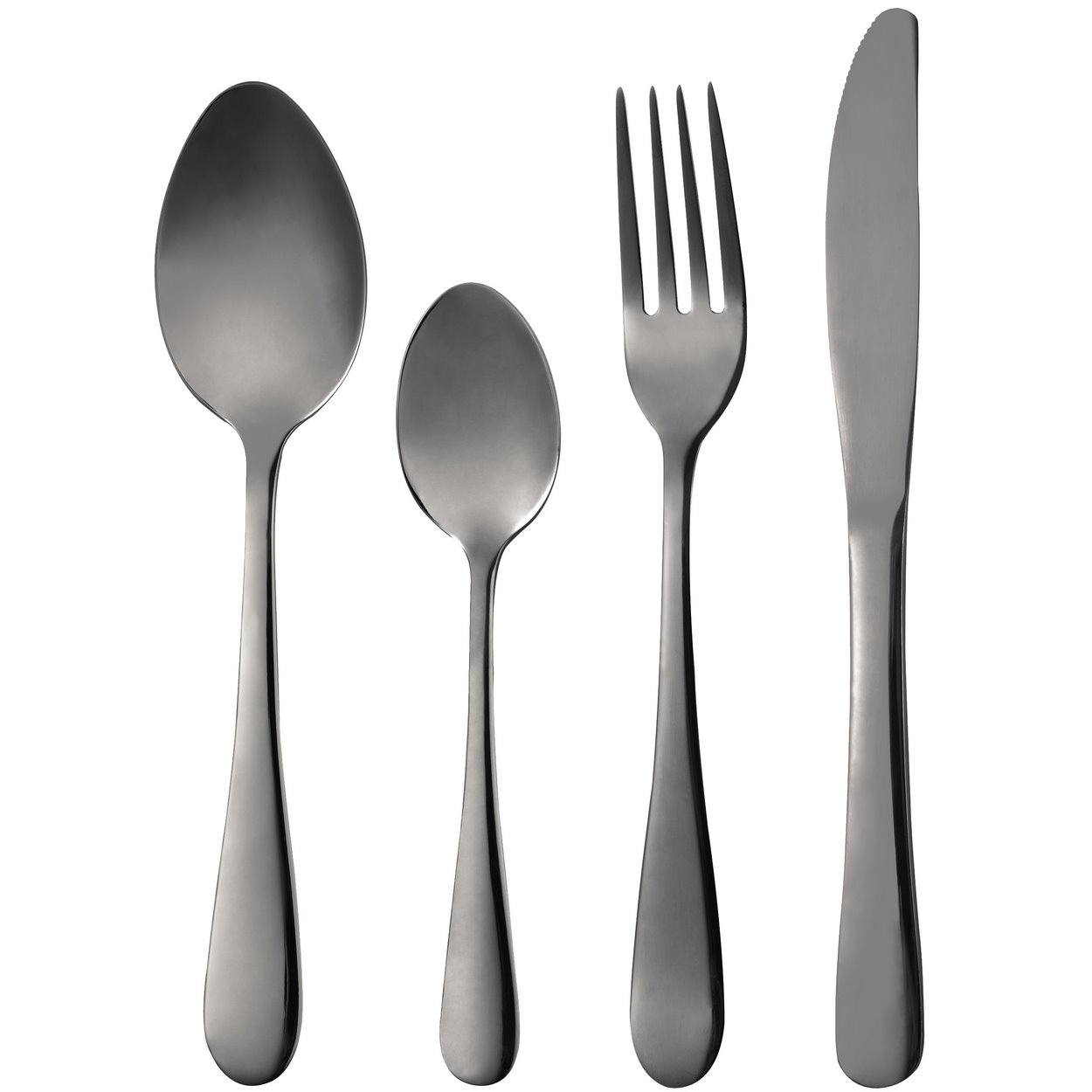 El set se compone de: 6 cucharas de sopa (20 cms); 6 tenedores (20 cms.); 6 cuchillos de mesa (23 cms.); 6 cucharillas de postre/café (14 cms.)